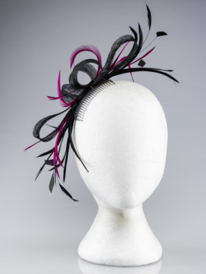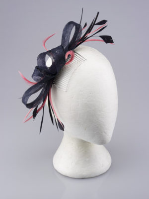 A delicate button shaped sinamay fasinator with a shaped goose feather mount and added coque feathers.The fasinator sits on an Alice Band.