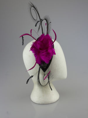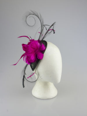 A small leafed sinamay fascinator with added loops and soft feathers.