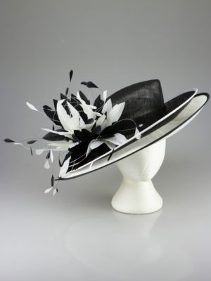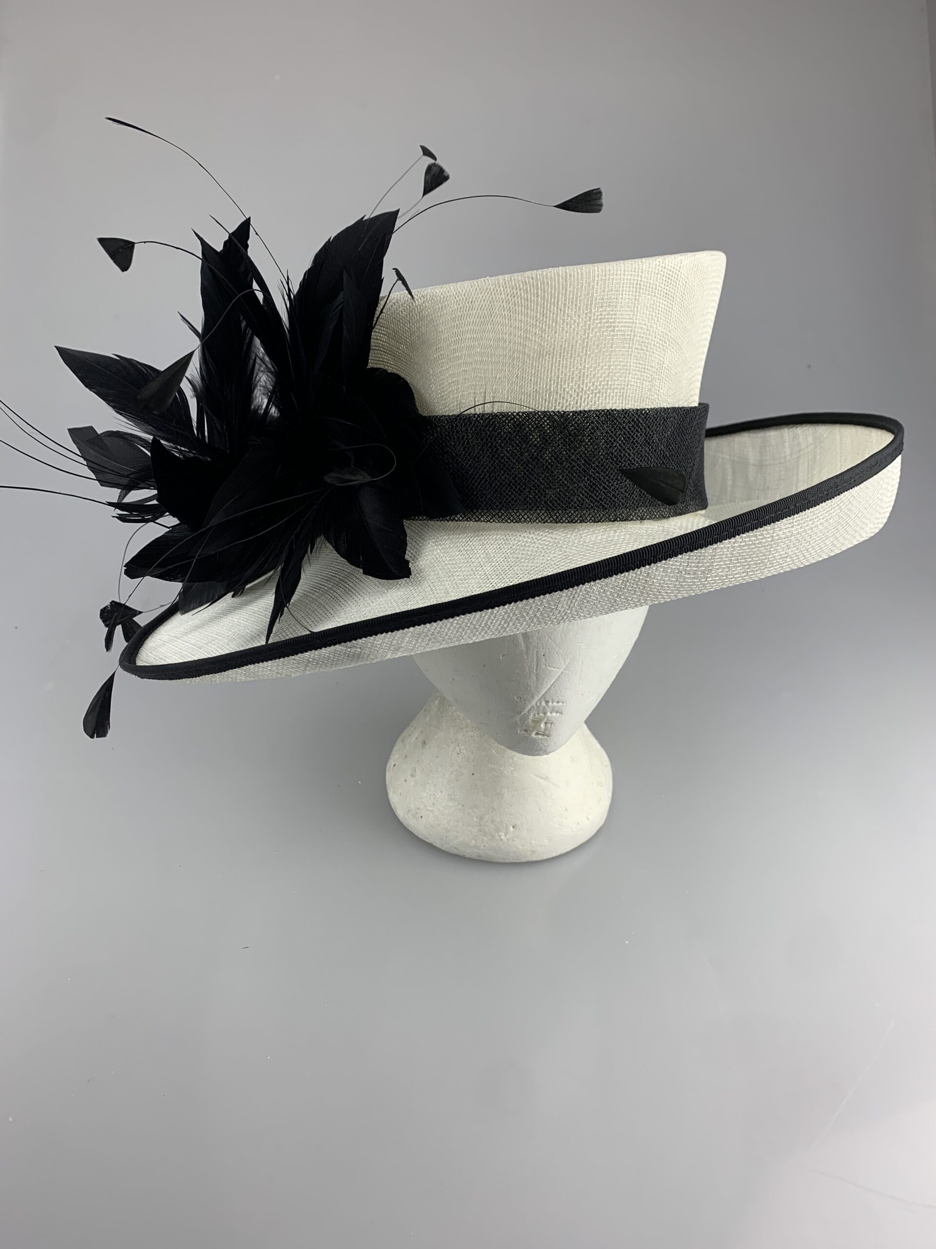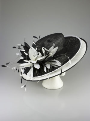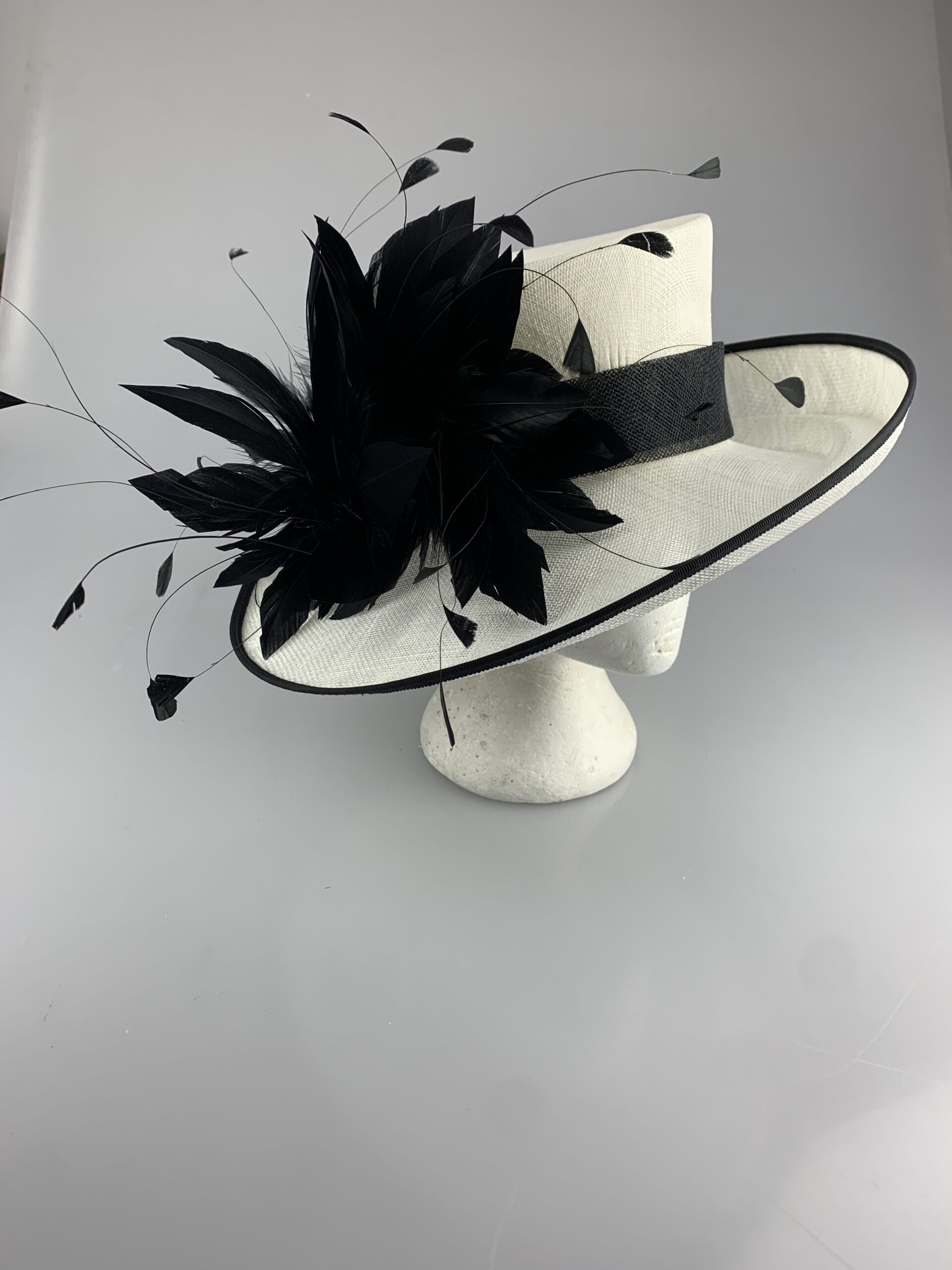 Teardrop Shaped Fasinator sitting on an Alice band. The fascinator has a pretty floral feather flower with added feathers, swirls of sinamay and crin.