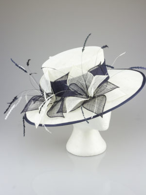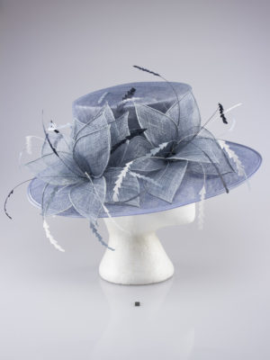 Teardrop Shaped Fasinator sitting on an Alice band. The fascinator has a pretty floral feather flower with added feathers, swirls of sinamay and crin.