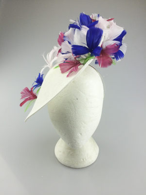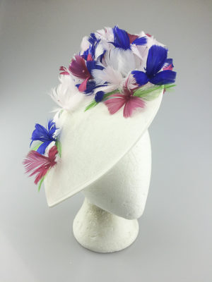A stunning hatinator with delicate feather flowers and added quills giving some height. Added sinamay swirls give some character to this hatinator which is worn on an alice band.
