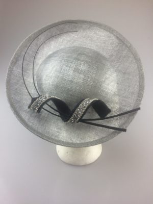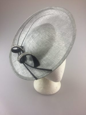 The hat has a rounded brim with sinamay band and a large floating feather which sweeps across the front of the hat, and diamante detailing to the front. It will compliment any outfit with that perfect look.