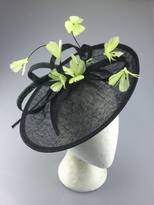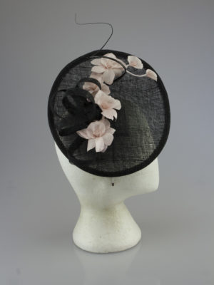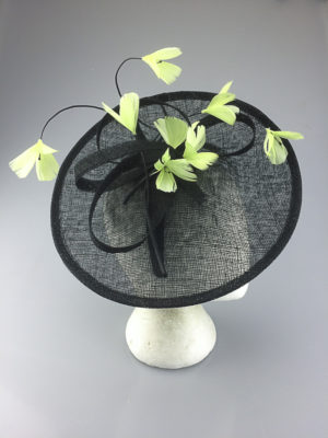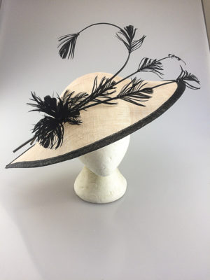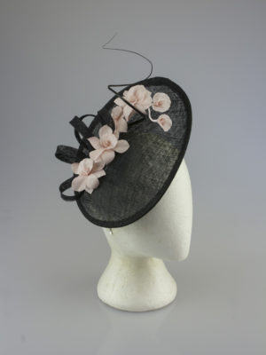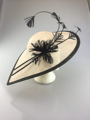 A gorgeous hatinator using a off set diamond shaped base with delicate feather flowers spread cascading over the base. This is worn on an alice band to the side of the head.